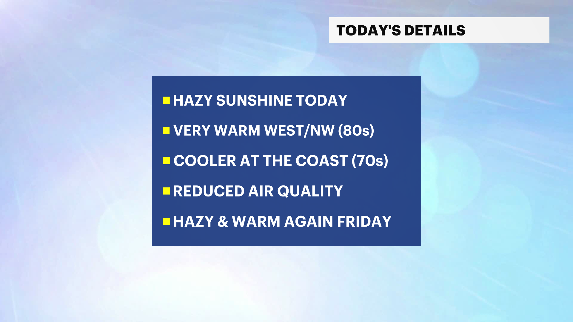 Hazy sunshine will last through today and tomorrow across parts of the state. With calm surface winds, the smoke will also stay near the ground in Ocean and Monmouth counties today.