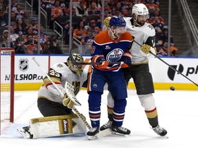The Edmonton Oilers’ Zach Hyman (18) battles the Vegas Golden Knights’ Nicolas Hague (14) and goalie Adin Hill (33) during first period NHL playoff action at Rogers Place, in Edmonton Saturday May 10, 2025. Photo by David Bloom /Postmedia