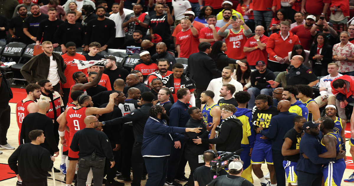 Benches clear between the Houston Rockets and the Golden State Warriors during the fourth quarter in Game 2 of the first round NBA playoff matchup at Toyota Center on April 23, 2025 in Houston, Texas.